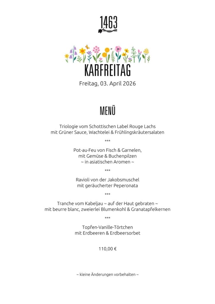 An Karfreitag servieren wir ein exklusives 5-Gang Menü mit Fisch und Meeresfrüchten (siehe unten).