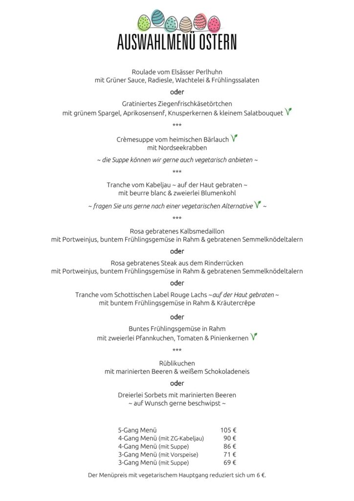 in der Karwoche und am Ostersonntag Mittags servieren wir ein Auswahlmenü in 3-5 Gängen.